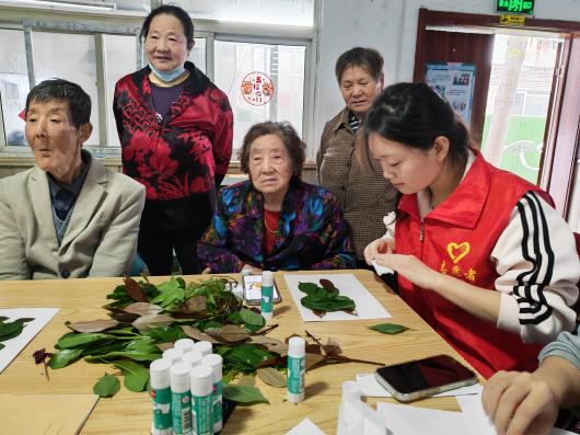 树叶画环节中,志愿者们提前收集整理形态丰富的树叶,准备彩纸、胶水、画笔等充足的手工材料,老人们在志愿者陪伴下挑选树叶进行构图与粘贴。在志愿者耐心协助下,一片片普通树叶被巧妙拼接,为老人们打造一段温馨愉悦、值得回味的春日时光。老人们看着自己亲手创作的作品,脸上露出欣慰的笑容。简单的树叶创作承载着老人们的情感与念想,自然之美与人间温情在此刻相融。