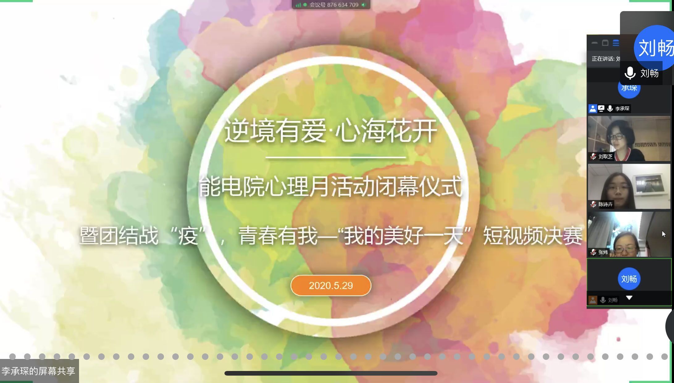 5月29日晚,能电院心理活动月“团结战’疫’,青春有我—我的美好一天”短视频大赛在网络平台顺利举办,学院心理健康教育月活动落下帷幕。短视频大赛邀请到了国产视频 心理健康教育与研究中心主任刘取芝、专职心理老师陈诗卉作为专业评委,学院党委副书记张炜出席并总结寄语。含少数民族生在内的12名参赛选手轮流展示个人作品,同时在线观看人数达到近200人。