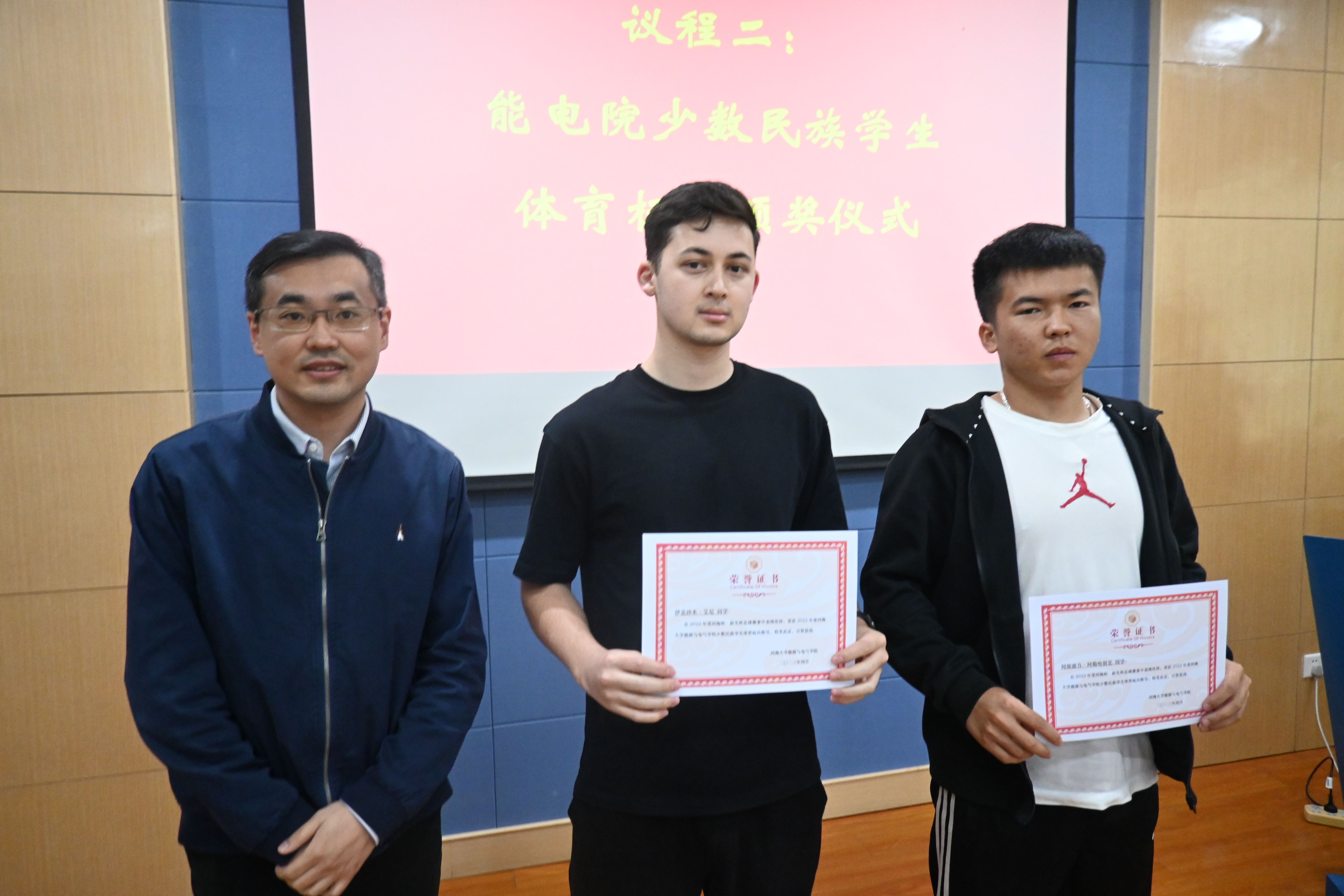 成立仪式上对2022年度在河海杯、新生杯等赛事中发挥特长、奋勇争先的少数民族学生进行了表彰,由张炜老师、孙瀚老师、孙丽莉老师分别为获得表彰的同学颁奖。