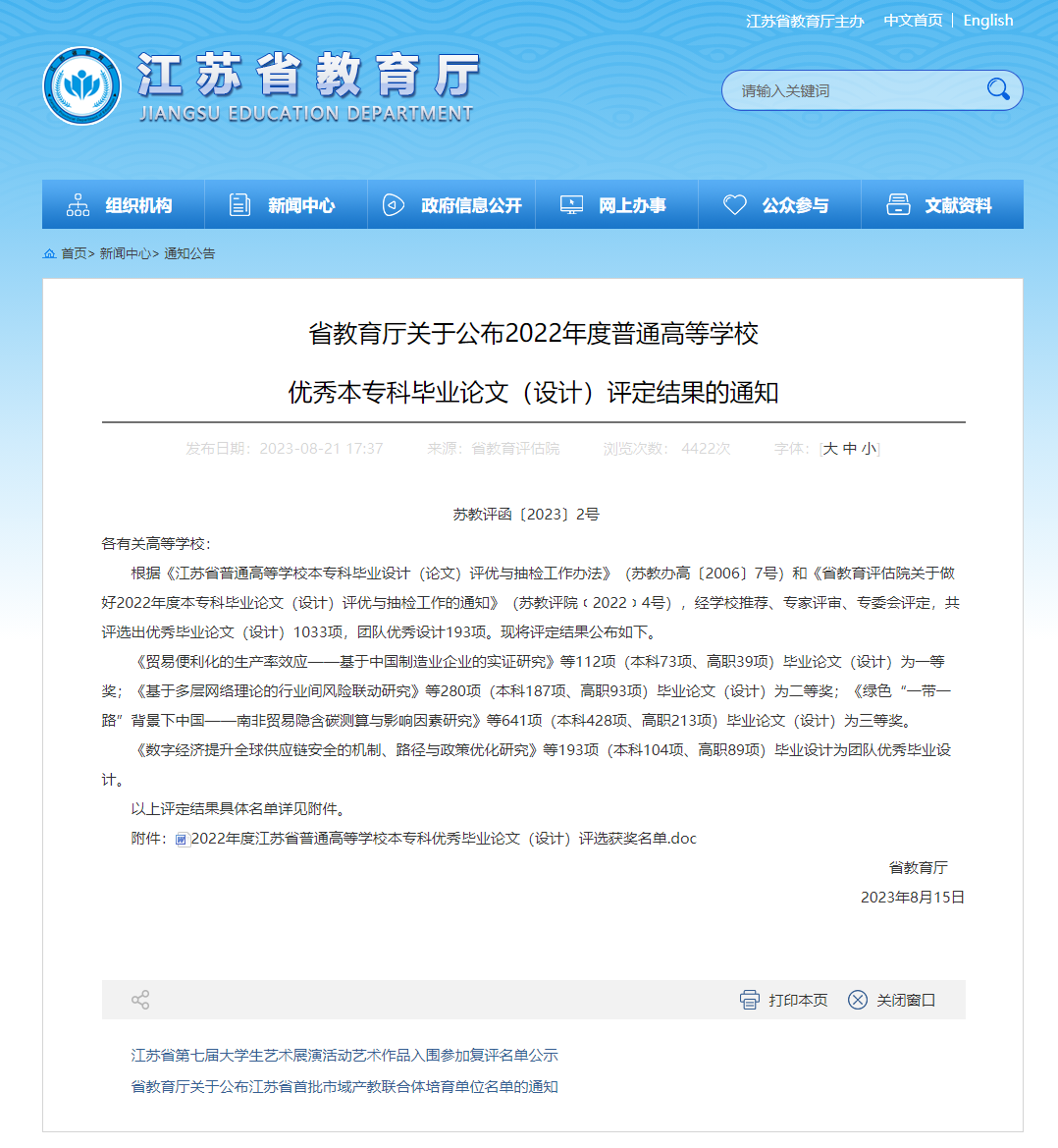 江苏省普通高等学校本专科优秀毕业设计(论文)的评选,是在高等学校择优推荐基础上,经省教育评估院组织专家评审选出,并由省教育厅审定。本次全省评选,国产视频 获一等奖4项、二等奖9项、三等奖2项以及团队优秀毕业论文(设计)3项,其中一等奖获奖数并列江苏高校第三名。