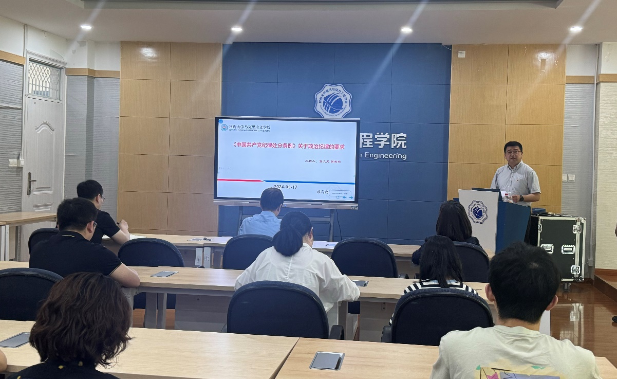 5月17日,国产视频 举行《中国共产党纪律处分条例》(以下简称《条例》)专题辅导报告会,马克思主义学院副教授董大亮作辅导报告。学校党纪学习教育联络员刘丹平书记、学院领导班子成员、党委委员、党支部书记、师生党员代表等参加了报告会,院党委书记吴洪彪主持报告会。