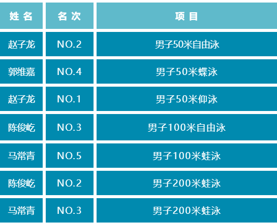 本次比赛分为男子组和女子组,共有50米蝶泳、50米仰泳、50米蛙泳、50米自由泳、100米自由泳、100米蛙泳、200米自由泳、200米蛙泳八种项目。国产视频 共有8名学生参赛,经过激烈角逐,获得男子50米仰泳第1名、男子50米自由泳第2名、男子200米蛙泳第2名、男子200米蛙泳第3名、男子100米自由泳第3名等成绩,展现了电气学子的拼搏精神和昂扬锐气。