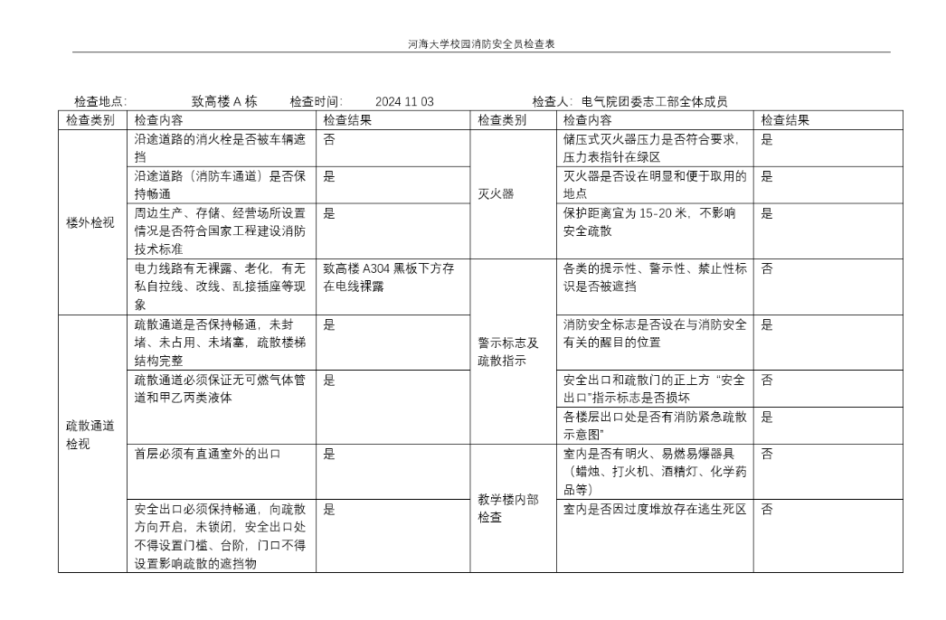 2024年11月3日下午,电气与动力工程学院团委志愿者工作部走进致高楼A栋,开展了大一新生踏入校园以来的第一次消防安全大巡查。本次活动旨在排查消防隐患,增强师生消防意识,防患于未“燃”。