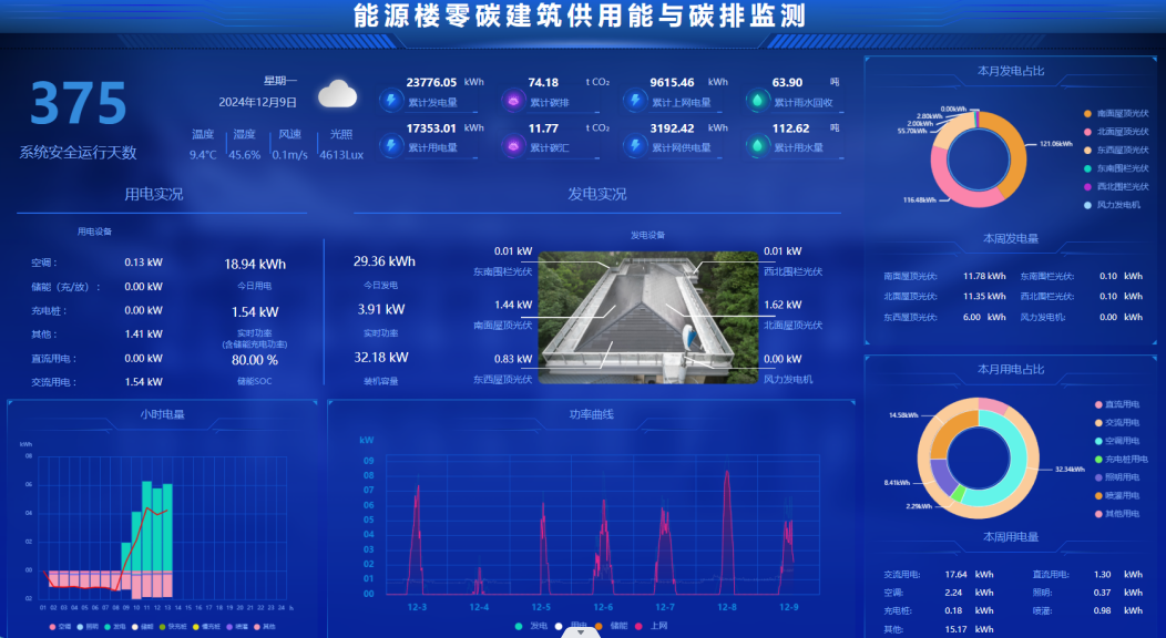 本项目创新突破并集成应用了被动式节能+风光储建筑/景观一体化、风光储直柔+源网荷储多能互补的零碳建筑微电网(光储充用直流微电网、风光热储用交流微电网、交直流柔性互联微电网)、零碳建筑电/热/冷供用能全过程电碳协同(实时动态碳排计算)、基于用能互联网的互动交易等关键技术,研制建筑微电网能源网关、建筑能耗与碳排放管控平台,在国产视频 西康路校区进行既有建筑绿色低碳智慧用能改造,本体节能率75%,综合节能率135%,实现负碳运行,是首个智慧用能与建筑节能相结合的零碳建筑。