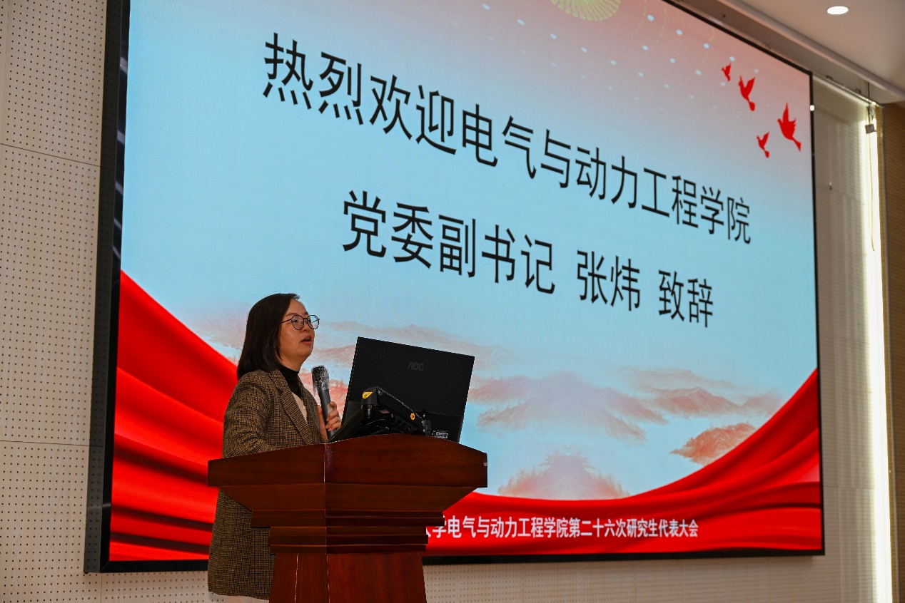 电气院党委副书记张炜代表学院向大会召开表示祝贺。张炜书记总结了电气院研究生会的主要工作及取得的成绩,并提出三点期望:一是作为新时代的研究生,要注重锤炼品格、博学笃行,不断筑牢成长根基,练就过硬本领;二是作为学生骨干,要矢志初心、勇担使命,成为同学信赖的贴心人;三是作为新一届研会成员,要在传承中创新活动形式,开创研会工作崭新局面。