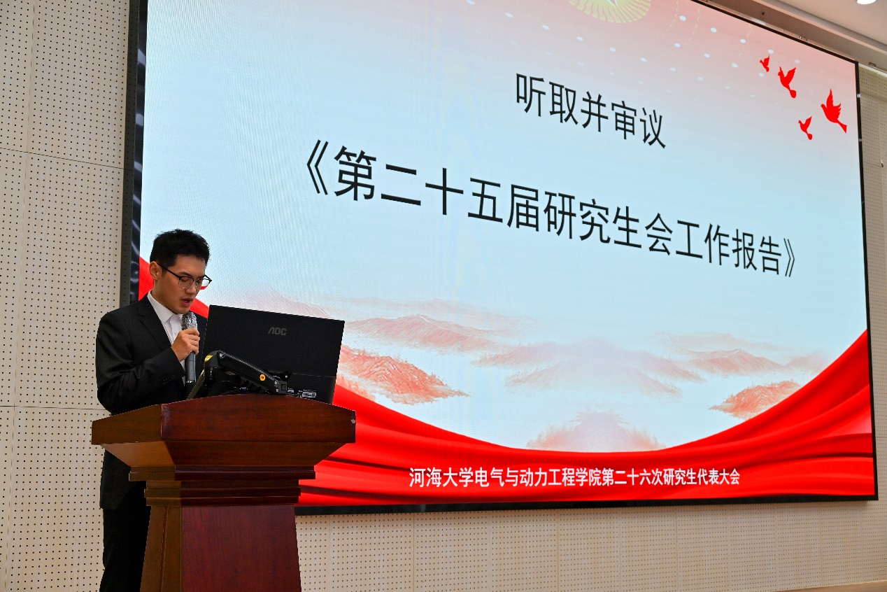 第二十五届研究生会主席团成员郭一畅代表上一届院研究生会,作了题为《责任与使命同在,青春与梦想齐飞》的工作报告,全面梳理了过去一年的工作实践与成果,号召新一届成员在后续工作中进一步完善工作机制、促进交流沟通、加强品牌建设,推动研究生会工作迈上新台阶。